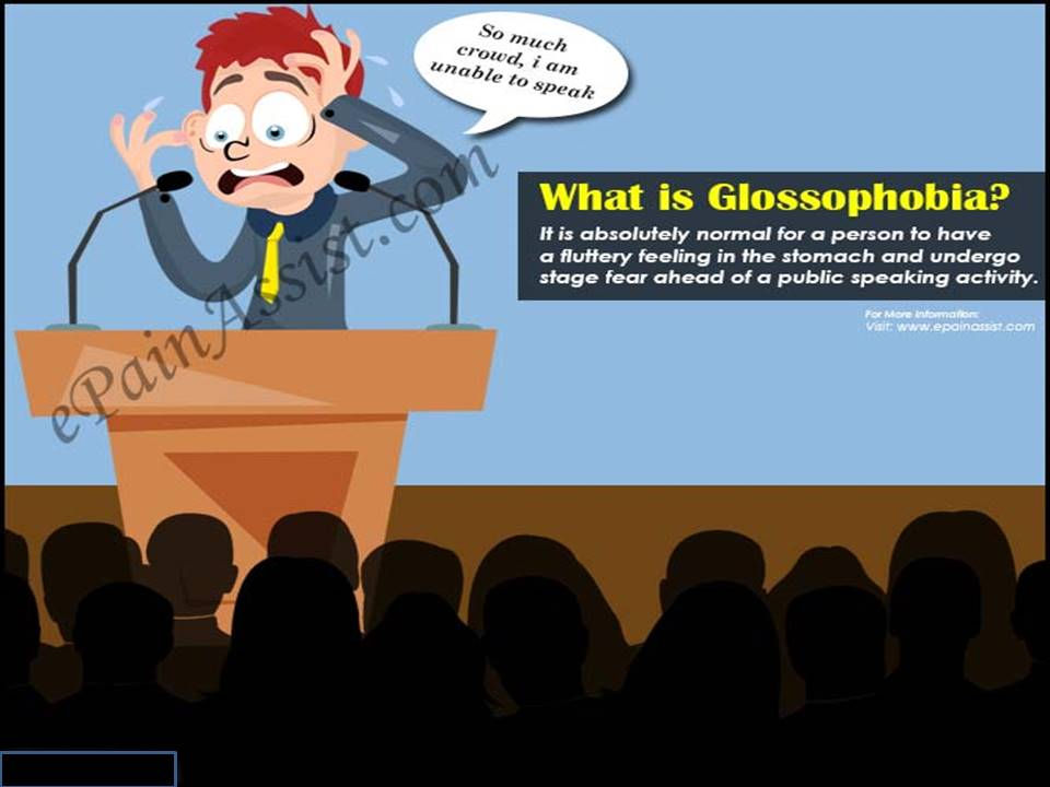 In case of extreme Glossophobia however, individuals simply freeze before their audience. They might be unable to speak. They might find that their mouth dries up or they start sweating, shaking or experiencing palpitations.